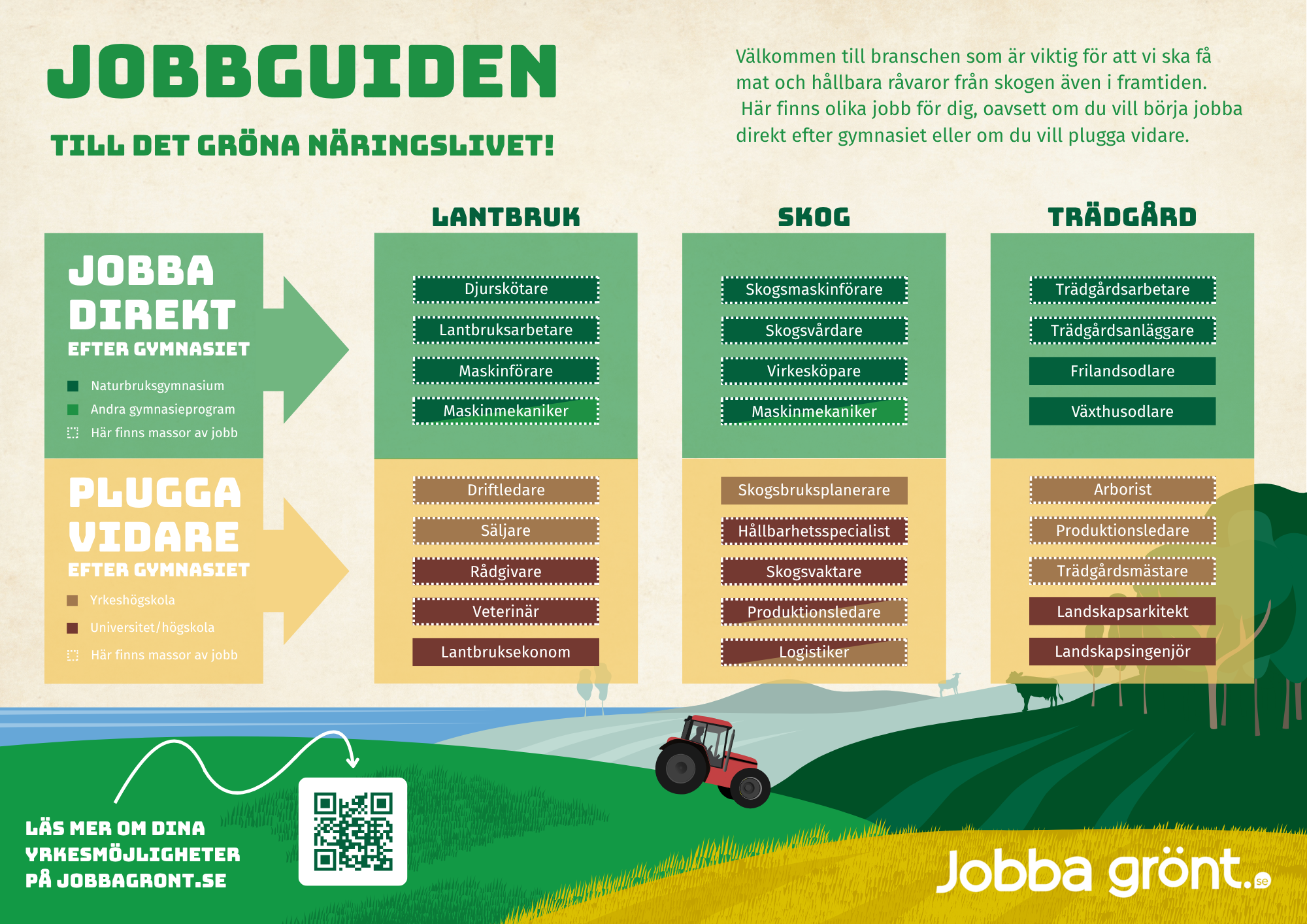 Det gröna näringslivet består av företag inom lantbruk, skog och trädgård. Med hjälp av jobbguiden får du en övergripande bild av branschens utbildningsvägar och olika yrkesroller. Du kan även ladda ner jobbguiden som PDF.
